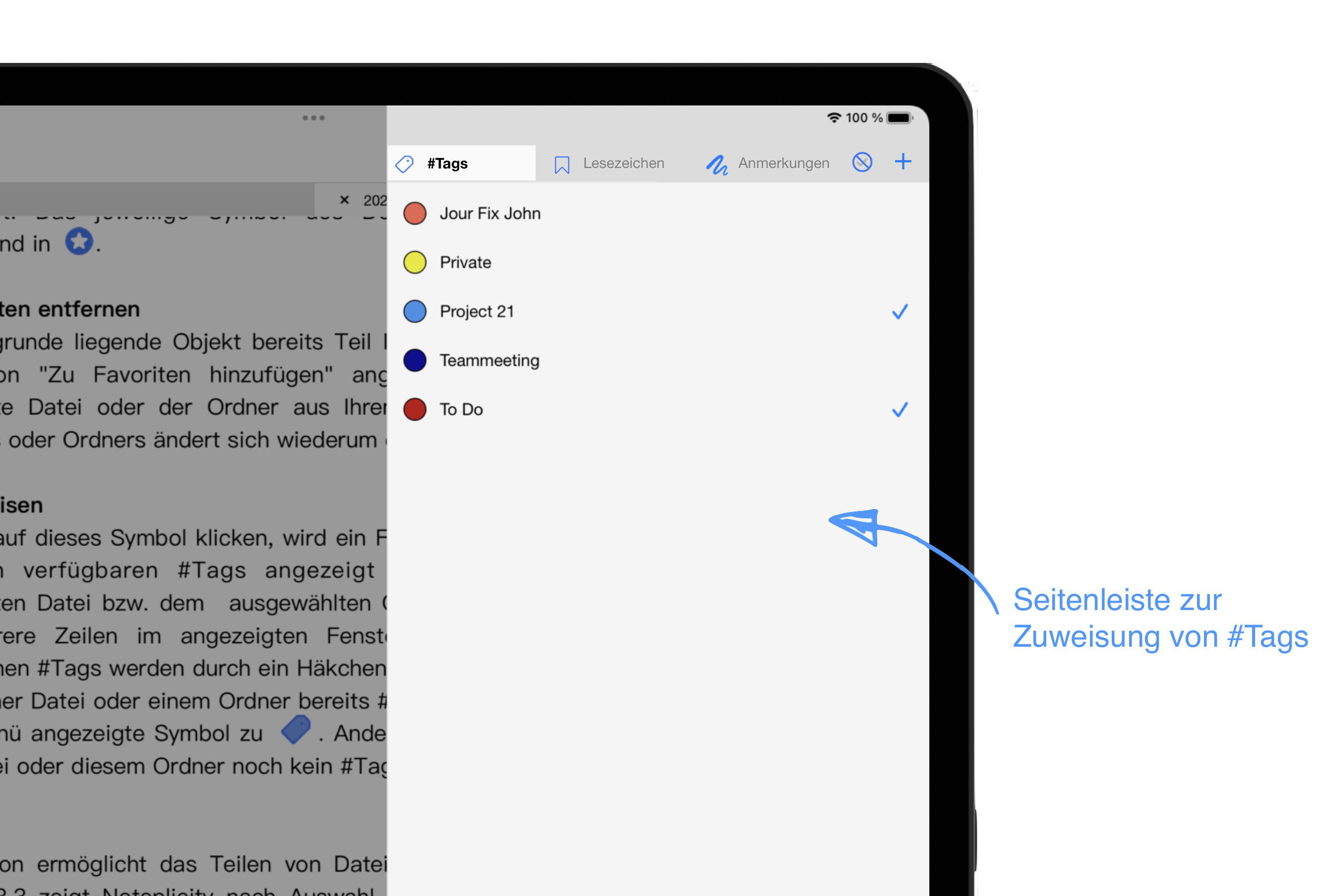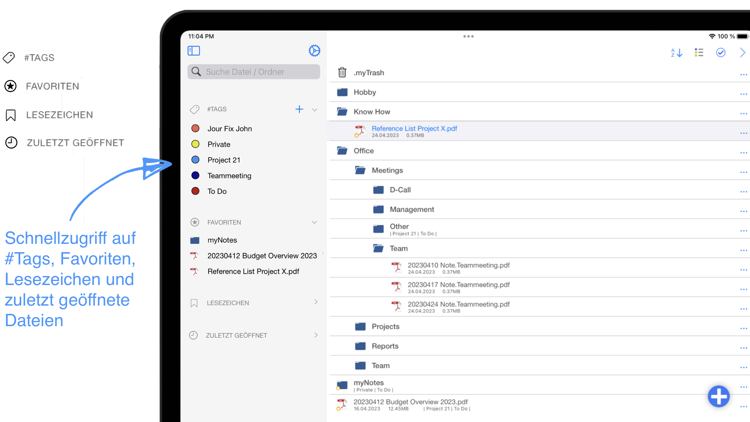 - Favoriten, #Tag-Filter, Lesezeichen und zuletzt geöffnete Dateien sind über den Schnellzugriff in der Seitenleiste immer direkt verfügbar